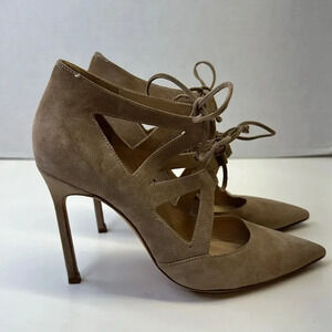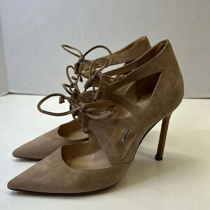 Manolo Blahnik Asaki High Heels Pumps Shoes Tie Front Suede Taupe Size 38 US 8