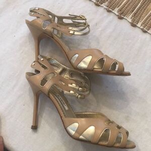 Manolo Blahnik Beige and gold cut out strappy sandal heel (39)