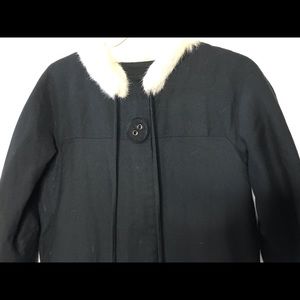It features a convenient 5 snap button closure and a detachable fur collar, although please note that the fur collar is shedding. The coat also includes hanging fur ball tassels for added charm.