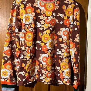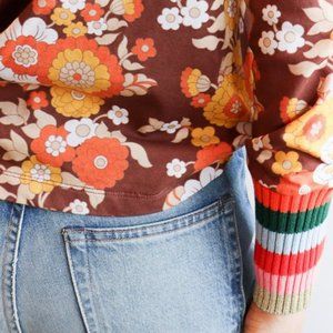 This is a long-sleeved cotton T-shirt with a round neck. The vintage floral print is given a twist by a multi-coloured edging. Color is "Marron" which is a reddish brown. Flowers are orange, white and gold.
