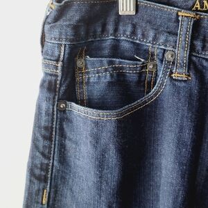 Good conditions American Eagle man jeans. No stains, rips or bad odors. Color dark blue. Zips up and buttons up for closure. Skinny jeans. Has two frontal pockets and two back. Comfortable. Light weight. 100% Cotton. Perfect to pair with your favorite t-shirt and sneakers. Please see pictures for more details.