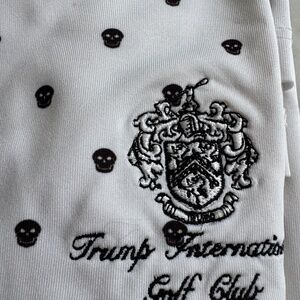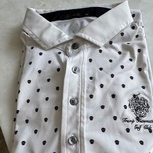 very attractive man’s golf shirt with dark blue design on a white background. It has a white collar. Practically brand new.