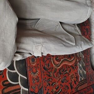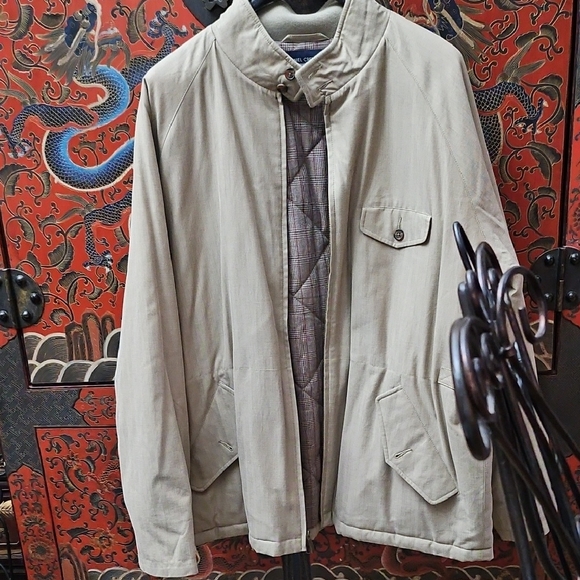 Khaki hunting style jacket. Brown British plaid liner. Adjust to fit at waist. Two large pockets in the front. Fishing too!