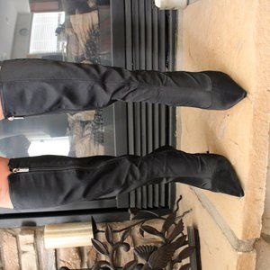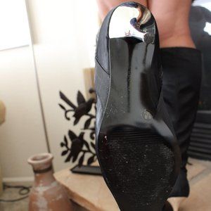 Worn only once, black silk satin stiletto boot. Has original box, zipper on the inside heel