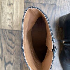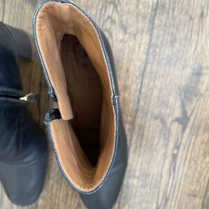 These boots show moderate wear consistent with normal use. The leather upper has some scuffing and creasing, particularly visible on the toes and ankle areas. The soles show wear from walking. The interior tan leather lining remains in good condition. All zippers function properly.