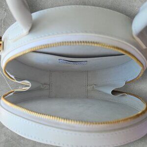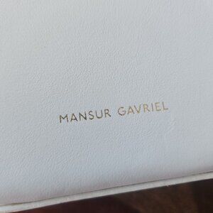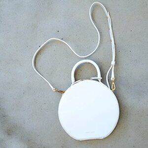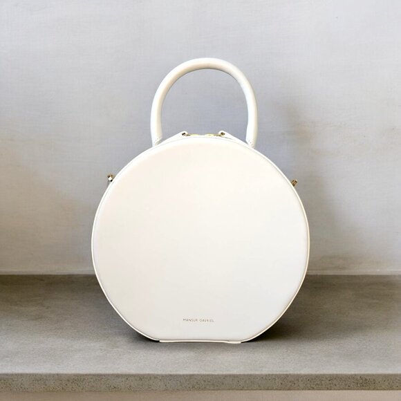 This Mansur Gavriel white leather circle bag is a chic and minimalist accessory that adds a touch of sophistication to any outfit. Perfect for day-to-night transitions, it combines style and functionality effortlessly.