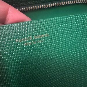Elegant emerald pouch with textured leather. Features gold embossed logo.
