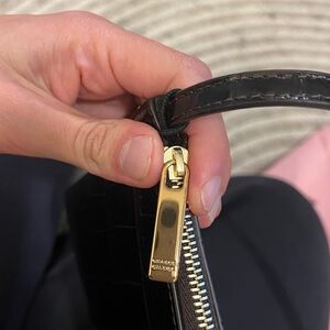 croc embossed design, top carry handle, gold tone hardware, brand logo accent