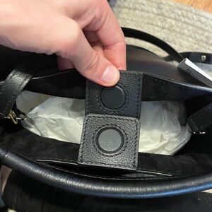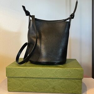New with tags. Never carried. Beautiful mini convertible top handle and crossbody small bucket bag from Mansur Gavriel in supple yet structured black leather. Hidden magnetic closure. Comes with dust bag. Made in Italy tag in interior. Retails for $695.