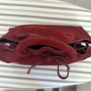 Amazing suede mansur Gavriel bag. Re poshing this bag. Wore it a few times has a little wear and tear on the Back one small spot that suede rubbed off. Very small spot see picture. Strap included