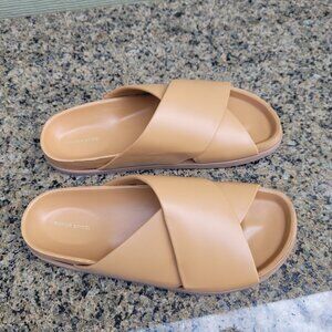 So very soft and easy to wear all day and night!! The lambskin leather is exquisite Like New Condition !!!! So very soft on your feet Molded footbed with flat rubber sole Rounded open toe with cross strap Camel in color Made in Portugal EU 38 Retails for $445+ tax