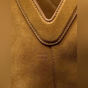 A sculptural silhouette subtly alludes to the 'M' in Mansur on a velvety suede shoulder bag featuring four ties for an all-axes-adjustable shape.