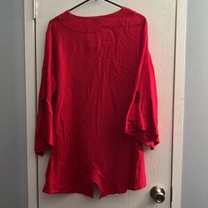Red tunic with an asymmetrical hem and V-neckline. 3/4 length sleeves and silky fabric texture, in EUC