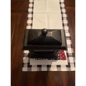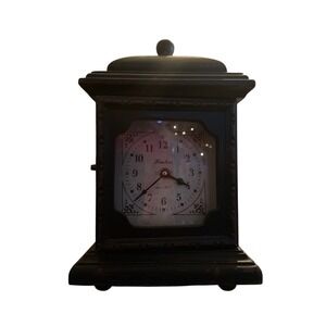 Beautiful mantle clock with hinged glass front. Distressed dark walnut color. Heavy, sturdy, classic piece.