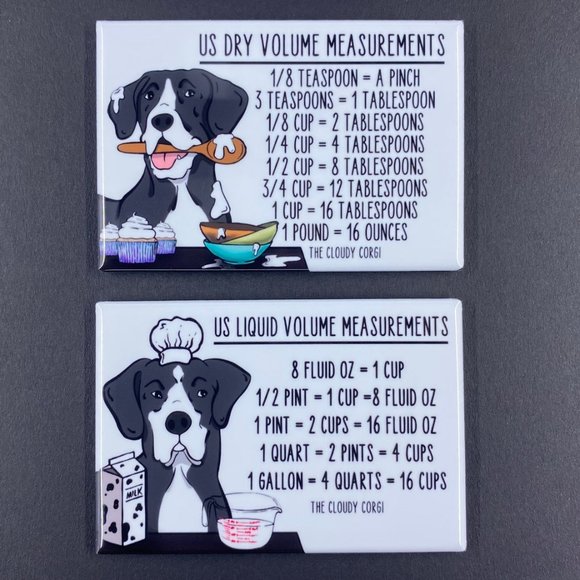 This handmade magnet set features hand illustrated dogs with handy conversion charts you can reference while cooking or baking!