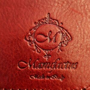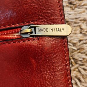 Authentic Manufactus Italy crossbody bag in rich red full-grain leather. Handcrafted in Italy with exceptional quality and detailing. Features a front zip pocket under flap, magnetic snap closure, and an adjustable leather strap. The interior is lined in natural leather and includes a zip pocket and slip pocket. Embossed logo on flap and interior tag reads “Genuine Leather Made in Italy.”