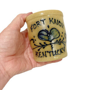Maple City Pottery USA Small Crock of Jar done with cobalt blue decoration for Fort Knox Kentucky - a charming Heart design makes this collectible souvenir perfect for a Farmhouse Kitchen or cottage shelf display. Clearly hallmarked - produced circa Y2K. In excellent condition with minor shelf wear but no damage or flaws - so cute!