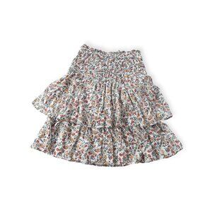 floral tiered skirt, Maple & Cliff skirt, casual floral skirt, summer skirt, multicolor skirt, women's tiered skirt, boho style skirt, floral print skirt, flared skirt, white floral skirt, elastic waistband skirt, lightweight cotton skirt, breathable fabric skirt