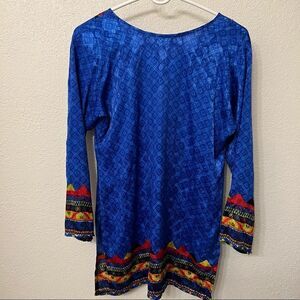 This colorful Indian style top is from Maple Clothing. The item has long sleeves. It has colorful decoration around the neck, the bottom and the cuffs. There is a floral design in the material. The label of what material makes up this top is missing. The top has a feel of silk but I can not be sure. There is also no size label. The measurements are 27” L x 21” W (pit to pit) x 21” sleeve (shoulder to cuff). This wonderful top has been gently worn but is in very good condition.
