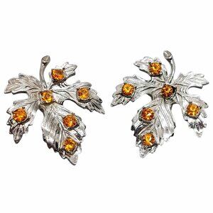 Maple Leaf Citrine Glass Silver Tone Clip On Earrings Vintage Estate Unsigned