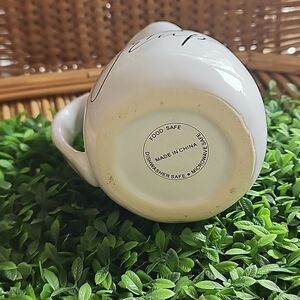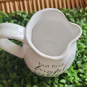 This white pitcher measures approximately 4" x 4 1/2" (with handle.)