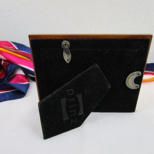 Nice small keepsake photo frame, maple wood with black beveled trim around the photo. Holds 2.5" x 3.5" photo, measures 3.75" x 4.75". Black velvet easy access back with easel for horizontal or vertical tabletop display. Excellent used condition with no flaws. Open to offers, bundle with other items for discount and savings on shipping costs.