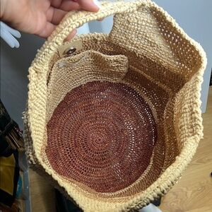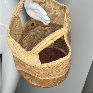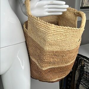This is a beautiful Mar Y Sol Hand Bag. This elegant tote bag showcases a stunning gradient of tan and brown hues, crafted from natural fibers for a rustic charm. Its cylindrical shape and open top make it perfect for beach outings or casual strolls. A distinctive rectangular cutout adds a touch of uniqueness to its design. Interior pocket. 12” tall 10.5” across the top opening. No odors. No tears. No stains. Folds flat for easy travel.