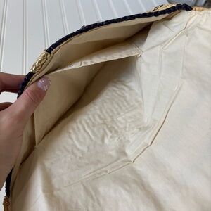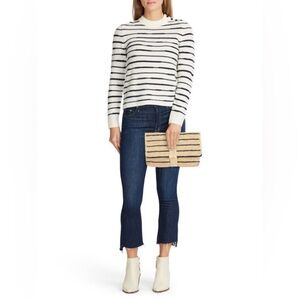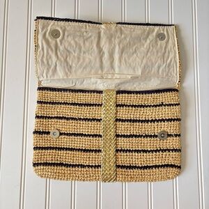 A simple foldover clutch is given effortless breezy style with a raffia composition and striped pattern.