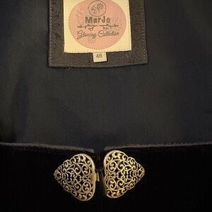 This beautiful authentic MarJo “Glowing Collection” Dirndl was purchased in Munich and worn only once. It features a deep navy velvet bodice, a subtle floral jacquard skirt, and a shimmering silver apron that ties elegantly at the waist. The delicate silver filigree clasp at the neckline and signature MarJo squirrel emblem add a classic touch of Bavarian craftsmanship. Size 46 (fits like a US 14). Originally €220, this Dirndl is in excellent condition with no flaws or signs of wear. Perfect for Oktoberfest, cultural festivals, or any special occasion where you want to celebrate timeless German style.