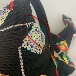 Whether you're putting together a performance look, festival outfit, or bold stage ensemble, this top works perfectly — especially with current trends toward performance-core, festivalwear, and statement dance/brassiere pieces. The black base and iridescent sequin embellishments fit right into rave, club, or concert wear aesthetics.