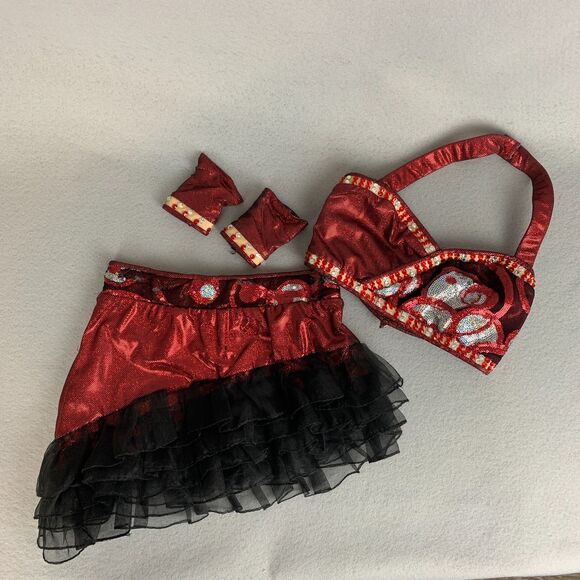 Mara Dancewear 3-piece red dance costume set in Child Large. Includes sparkly red sequin bra top, tiered black mesh ruffle skirt, and matching wrist cuffs. Bold statement colors perfect for competition, recital, holiday performances, or themed events. Features shimmering sequin detailing and rich red metallic fabric—right on trend with festive performancewear and stage-ready brights.