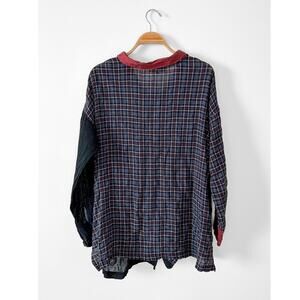 DETAILS: part top, part jacket! Beautiful medium weight linen button down from Mara Gibbucci made in the EU! Features a navy, dark red and white plaid side with a solid black contrasting side.
