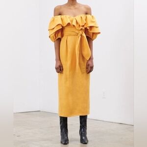 TAG: wedding guest party date night celebration Anthropologie Yellow ruffle off shoulder dress Tuckernuck Bohemian vacation resortwear beach
