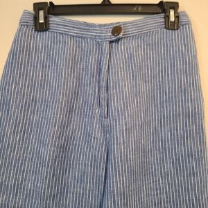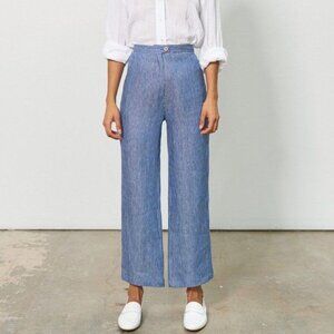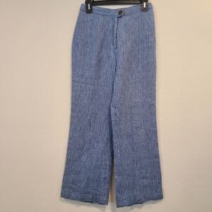 Mara Hoffman Arlene Blue Striped Linen Wide Leg Pants. These pants are high rise, have wide leg and ankle length. They have a button and zipper fly and are blue with white stripes. They are in great preowned condition, the button is a little loose.