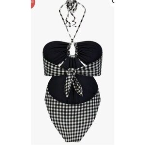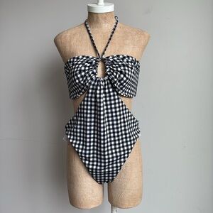 Blanca is a fully-lined one-piece bathing suit with a high-leg cut. Featuring center and side cutouts, adjustable ties at the neck and back and a low, open back. Provides minimal coverage. Made from recycled polyester, polyester and elastane with UPF 50+ protection in our custom Olympia plaid, a repurposed fabric from previous seasons.