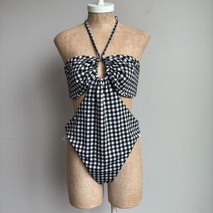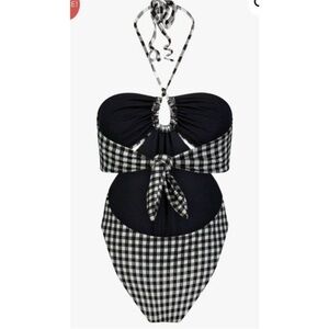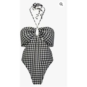 Blanca is a fully-lined one-piece bathing suit with a high-leg cut. Featuring center and side cutouts, adjustable ties at the neck and back and a low, open back. Provides minimal coverage. Made from recycled polyester, polyester and elastane with UPF 50+ protection in our custom Olympia plaid, a repurposed fabric from previous seasons.