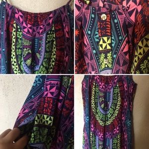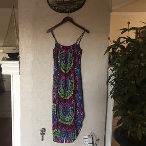 This dress has a round neck, spaghetti straps, and a button placket down front. Side slits to allow you to tie the dress