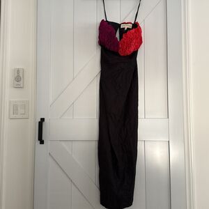 The Carmen dress from Mara Hoffman is a lined strapless dress with a mid-length column skirt. Featuring purple and red ruffle applique along the bust, sweetheart neckline, invisible back zipper and center back slit. Made from a blend of organic cotton and TENCEL lyocell.
