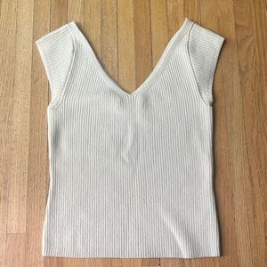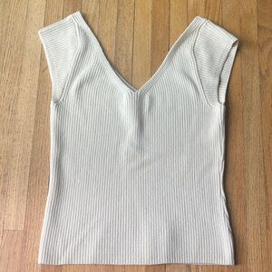 Chic cream ribbed tank top. Features a deep V-neck. Perfect for layering or wearing alone. Stretchy, cozy sweater material.