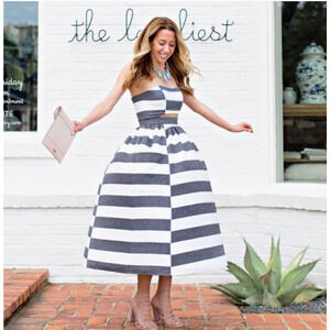 Darling strapless midi dress featuring a femme fit and flare slape with bold striped print and a cute cut out center.