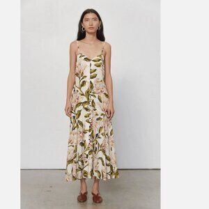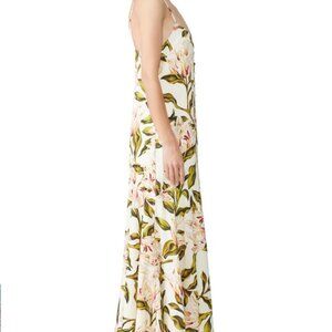 Elegant maxi dress with floral print. Features spaghetti straps. Perfect for summer occasions.