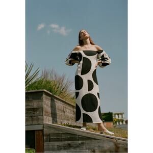 Mara Hoffman Genvieve midi dress, size 4. Features bold geometric motif, square neck puff sleeves and back zipper closure. 60% Tencel, 40% linen. Dry clean.