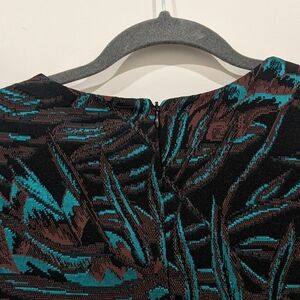 Herbarium Jacquard Fitted Long Sleeve Dress in Teal Multi by Mara Hoffman. Botanical jacquard fabric has a slightly metallic sheen. Brown and teal. Round neckline. Form fitting with stretch.