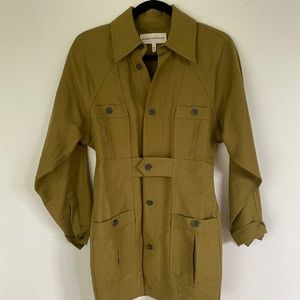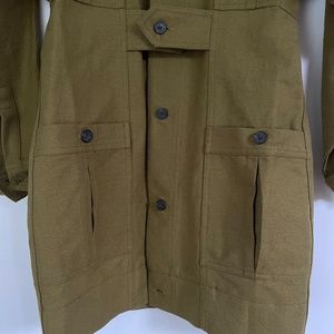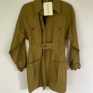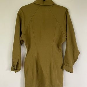- safari-style mini dress with spread collar, raglan shoulders, dropped underarm seams, and exaggerated sleeves