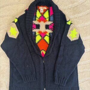 Cozy Alpaca blend sweater with a fun neon pattern! Navy with a neon pink/yellow pattern on the back.