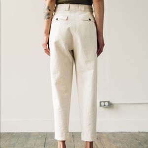 Jade high waisted pant in natural flecked linen cotton. Pleated at front. Side and back pockets. Belt loops. Tapered leg.