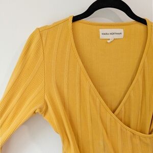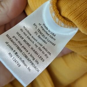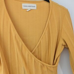 Deep v crossover neckline, 3/4 length sleeves, and snap crotch closure.