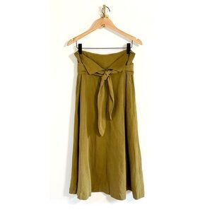 Anna is an unlined full, paneled skirt that hits at mid-calf. Folded over fabric and self-tie belt create a paper-bag-like waistline. Features an invisible zipper at the center front.