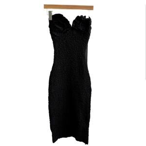 Mara Hoffman Mona Strapless Midi Dress in Black. Women's Size XS / Extra Small. Features pop corn texture, smocking throughout and elastic along the top, embellished with hand tacked rosette on the bust, strapless neckline, sleeveless, bodycon silhouette, long midi length, unlined. 100% organic cotton. Minor fading. Retail $725.