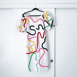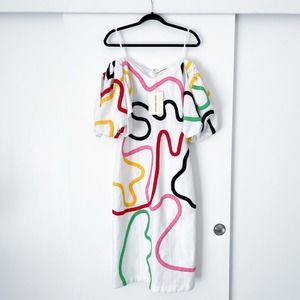 Mara Hoffman's 'Namari' dress has dramatic puffed sleeves with elasticated trims, so you can wear them on or off-the-shoulders. Colorful stripes create a bold, abstract design on a linen-blend dress with a wide V-neckline that can be worn on or off the shoulder. It's cut from linen and organic cotton-blend twill, which are grown without the use of pesticides or synthetic fertilizers, and has vertical seams that accentuate the slightly loose fit. New with tags.